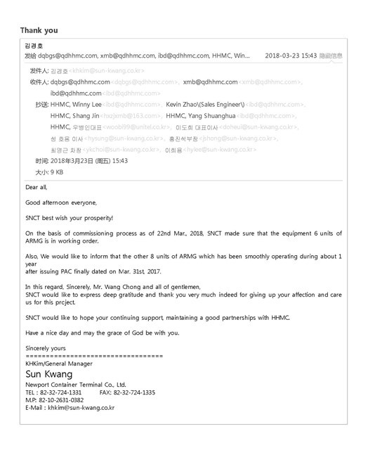 3月21日,海西重機(HHMC)為韓國鮮光新港集裝箱碼頭有限公司(SNCT)制造的6臺40噸自動化軌道吊順利交付投產(chǎn)。