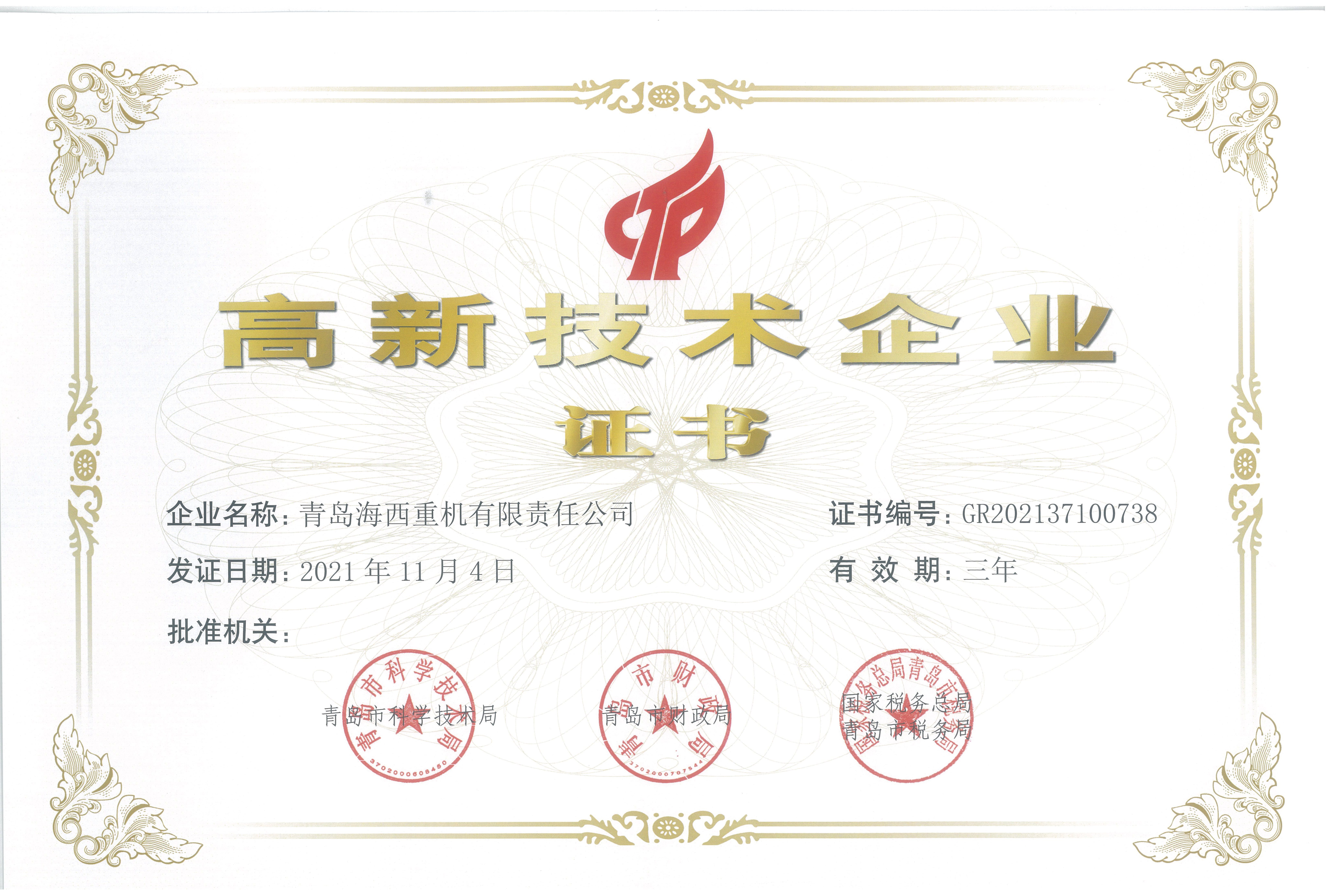 成功通過高新技術企業(yè)認定,對于提高市場經(jīng)營競爭力,提升企業(yè)品牌影響力具有重要作用,是公司實力和能力的體現(xiàn)。多年來,海西重機一直堅持突出技術引領戰(zhàn)略,強化技術創(chuàng)新,以技術創(chuàng)新帶動高質(zhì)量發(fā)展為重點,取得了較好成績。公司獲得了山東省首臺套技術裝備3項、山東精品裝備產(chǎn)品2項、山東創(chuàng)新工業(yè)產(chǎn)品1項、集團公司科技獎勵6項,青島市科技獎1項,科技成果鑒定11項,西海岸區(qū)級人才2人……