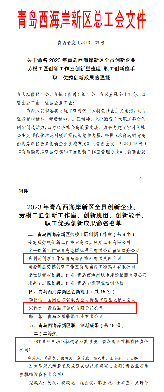 此次評(píng)選工作由青島西海岸新區(qū)總工會(huì)組織開展,經(jīng)過海西重機(jī)基層工會(huì)推薦,資料申報(bào)、西海岸新區(qū)總工會(huì)資格審查、專家組評(píng)審,區(qū)總工會(huì)現(xiàn)場(chǎng)考察、會(huì)議研究及社會(huì)公示等環(huán)節(jié),最終“肖利濤創(chuàng)新工作室”榮獲西海岸新區(qū)“勞模工匠創(chuàng)新工作室”榮譽(yù)稱號(hào),位居同類第三;“40T系列自動(dòng)化軌道吊及其系統(tǒng)(完成人:馬著凱、蔡黃河、余珍勝、楊雙華、王金東、丁云鵬)”榮獲西海岸新區(qū)“職工創(chuàng)新成果”二等獎(jiǎng);宋祥吉同志脫穎而出,榮獲西海岸新區(qū)“職工創(chuàng)新能手”榮譽(yù)稱號(hào)。